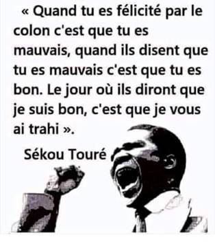 « Quand tu es félicité par le colon c'est que tu es mauvais, quand ils disent que tu es mauvais c'est que tu es bon. Le jour où ils diront que je suis bon, c'est que je vous ai trahi ». Sékou Touré |