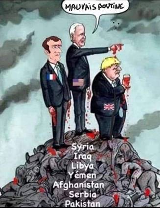 [26] Le culot de cette propagande est de mettre les destructions en Syrie (à Alep, Idleb, la Ghoutta, causées par les bombardements intensifs de l’aviation russe, sur le dos de l’Occident et les problèmes de l’Afghanistan sur le dos de l’Occident, alors que ces problèmes ont commencé avec le coup d’état communiste, en 1978, à l’instigation de l’URSS, puis avec l’Intervention militaire soviétique en Afghanistan, en 1979.